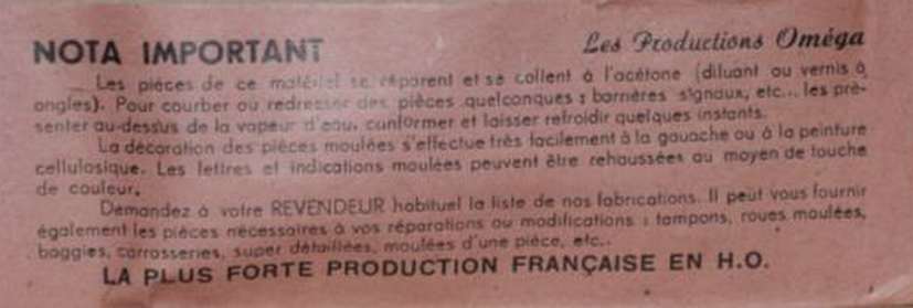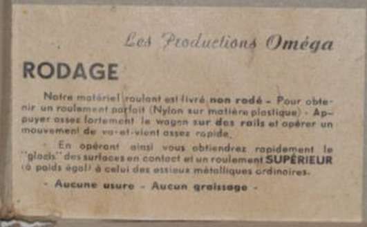 La marque OMEGA figure également dans les catalogues de la Sources des Inventions de Mars 1950 à 1953. (catalogue Mars 1950 page 60, Septembre 1950 page 58, catalogue 1951 page 56 et catalogue 1953 page 40. Sur ce même catalogue il est possible que les wagons mentionnés à la page 57 soit une production OMEGA à moins que se soit des Martin ou des Miniatrain.