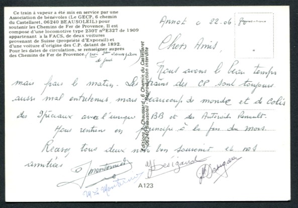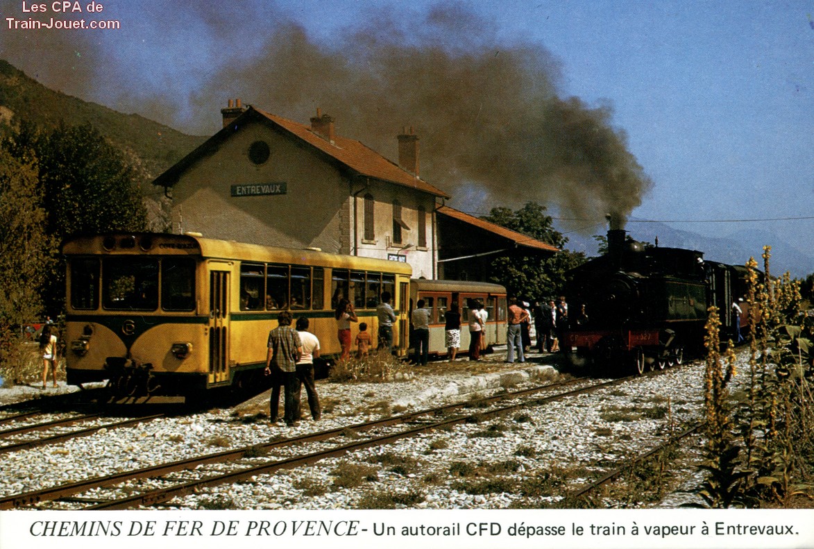Un Autorail CFD dépasse le train à vapeur à Entrevaux. |