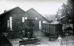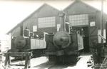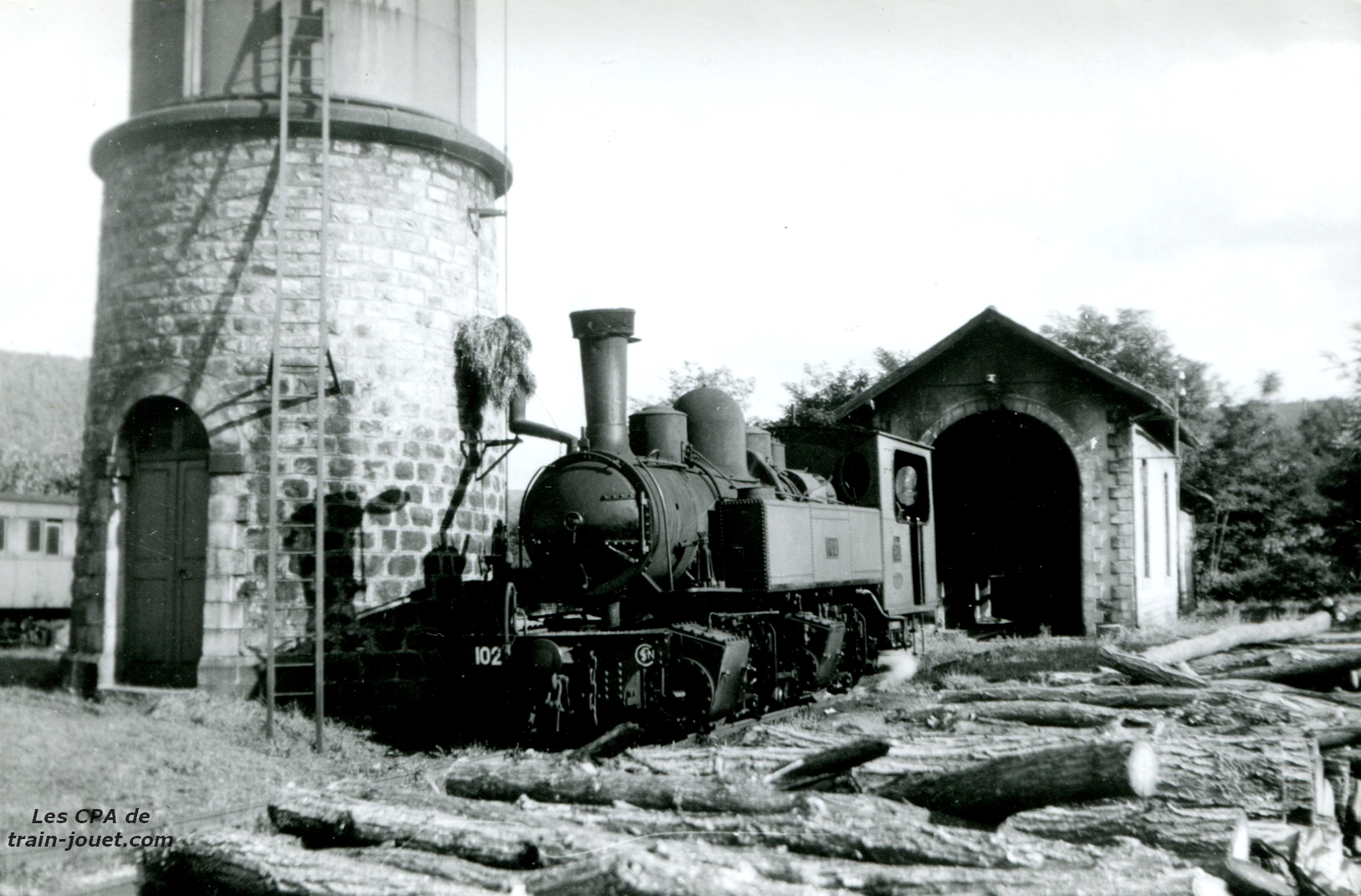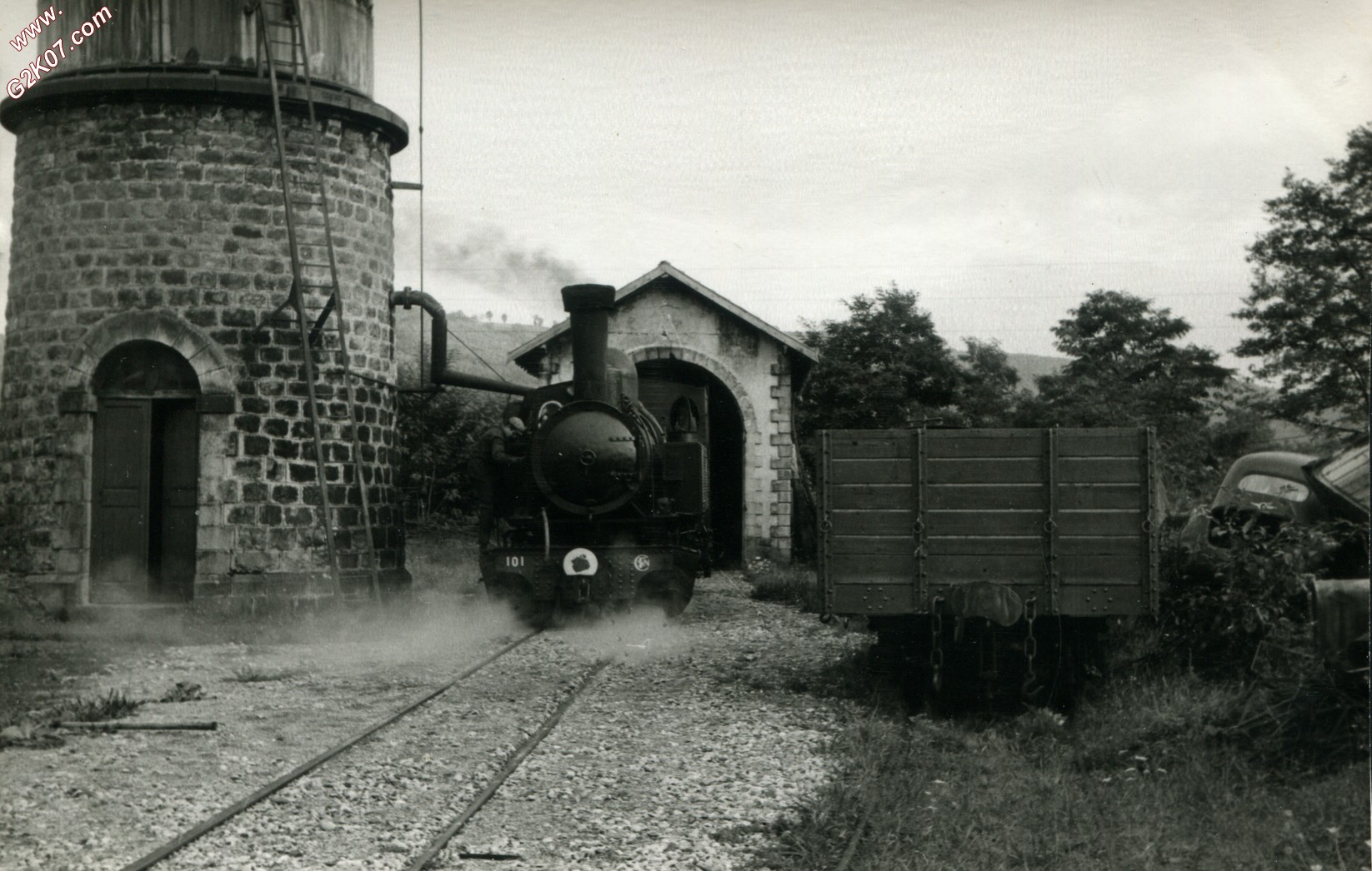 Locomotive Mallet n°101 fait le plein d'eau sortie de hangar