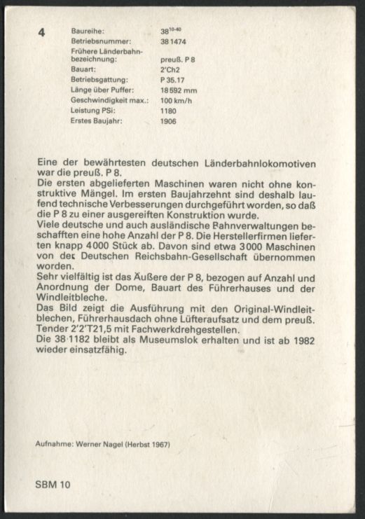 NO POSTKART - Allemagne - DatenblattLokomotive 38 1474 Preuß. P8 - DeutchWerner Nagel |