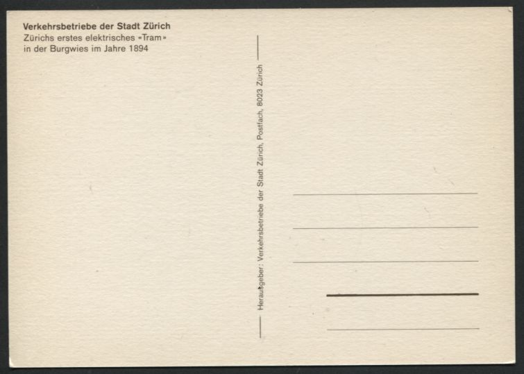 Année 1894 REPRO - Suisse - ZürichVerkehrsbetriebe der Stadt ZürichZürichs erstes elektrisches "Tram" |