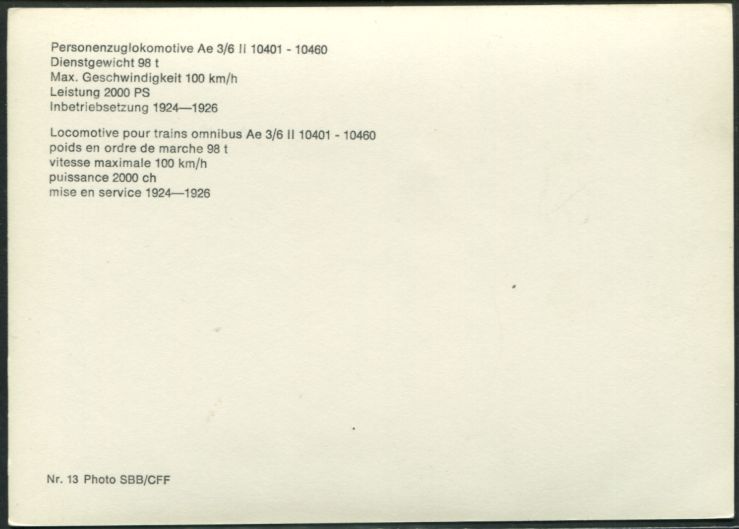 Suisse - Locomotive électrique Ae 3/6 II 10409n°13 Photo SBB |