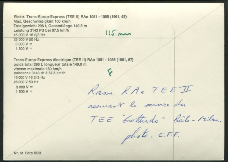 Suisse - TEE RAe 1051 - 1055 (1961,67)n° 51 Photo SBB |