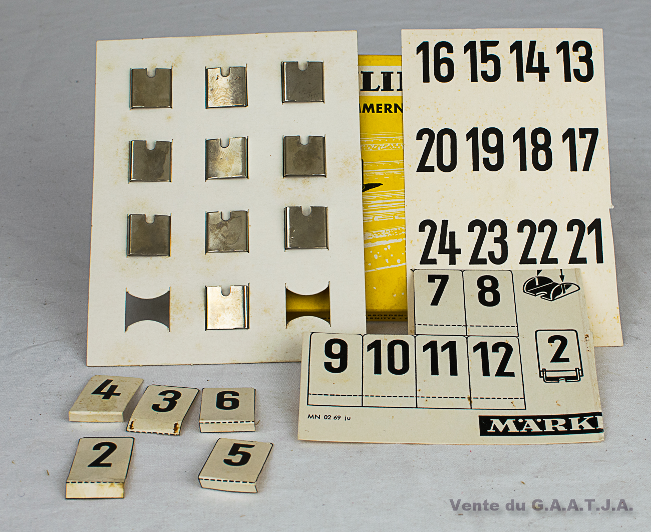 Une boîte incomplète de repaires numérotés. Il manque 2 supports métalique. Référence chez Märklin 7195. 8 Eur.