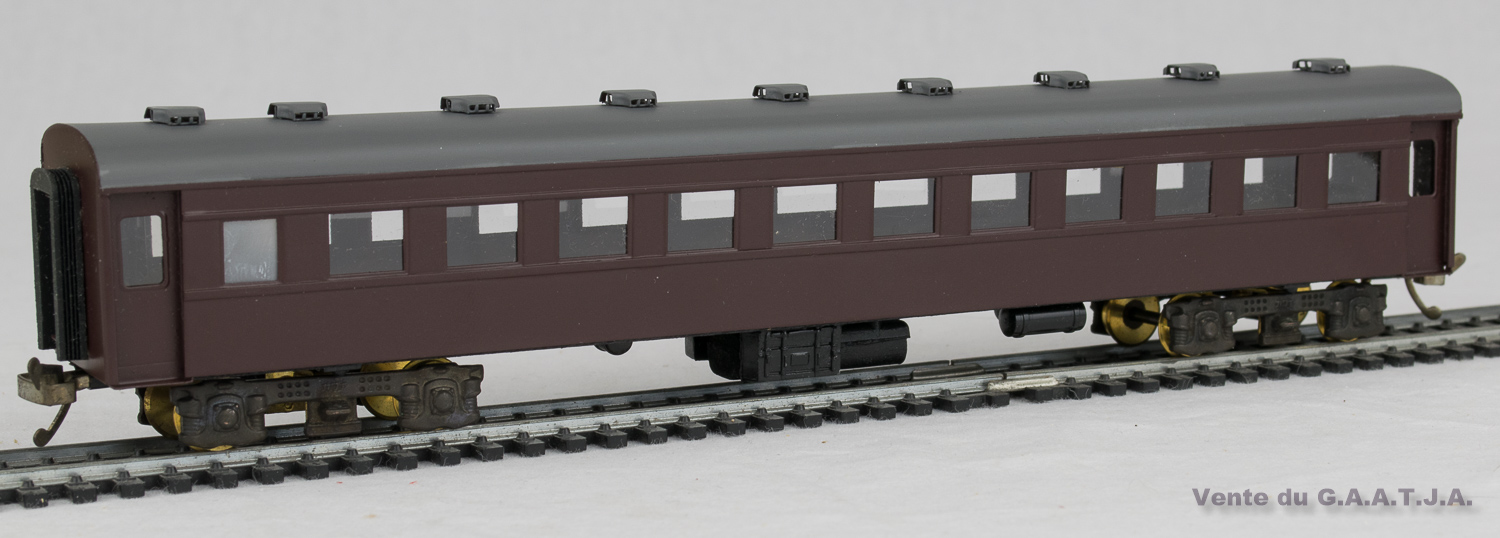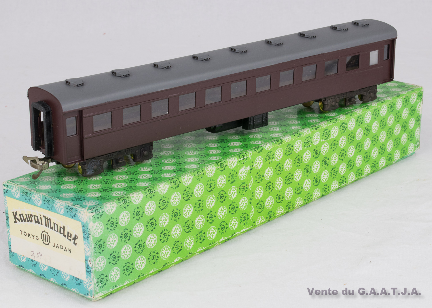 Voiture Passagers Japonaise tirée d'un kit. Plastique, métal et bois. Excellent état. Avec sa Boîte d'Origine. |