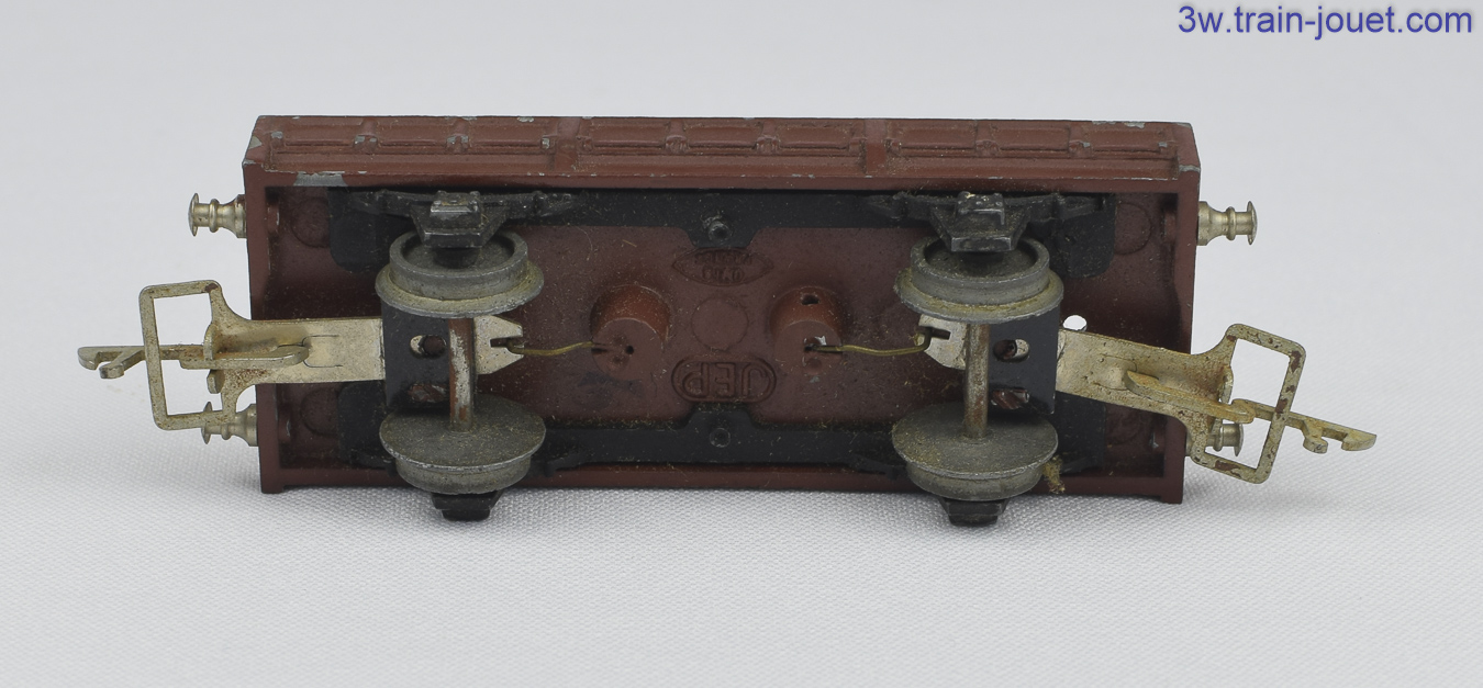 Un wagon plate-forme à essieux, marron. Complet en bon état, légèrement marqué à l'intérieur. Référence chez JeP: 6691. 7 Eur.