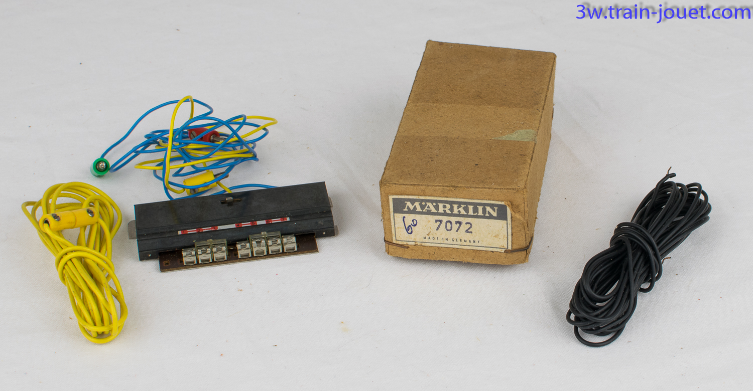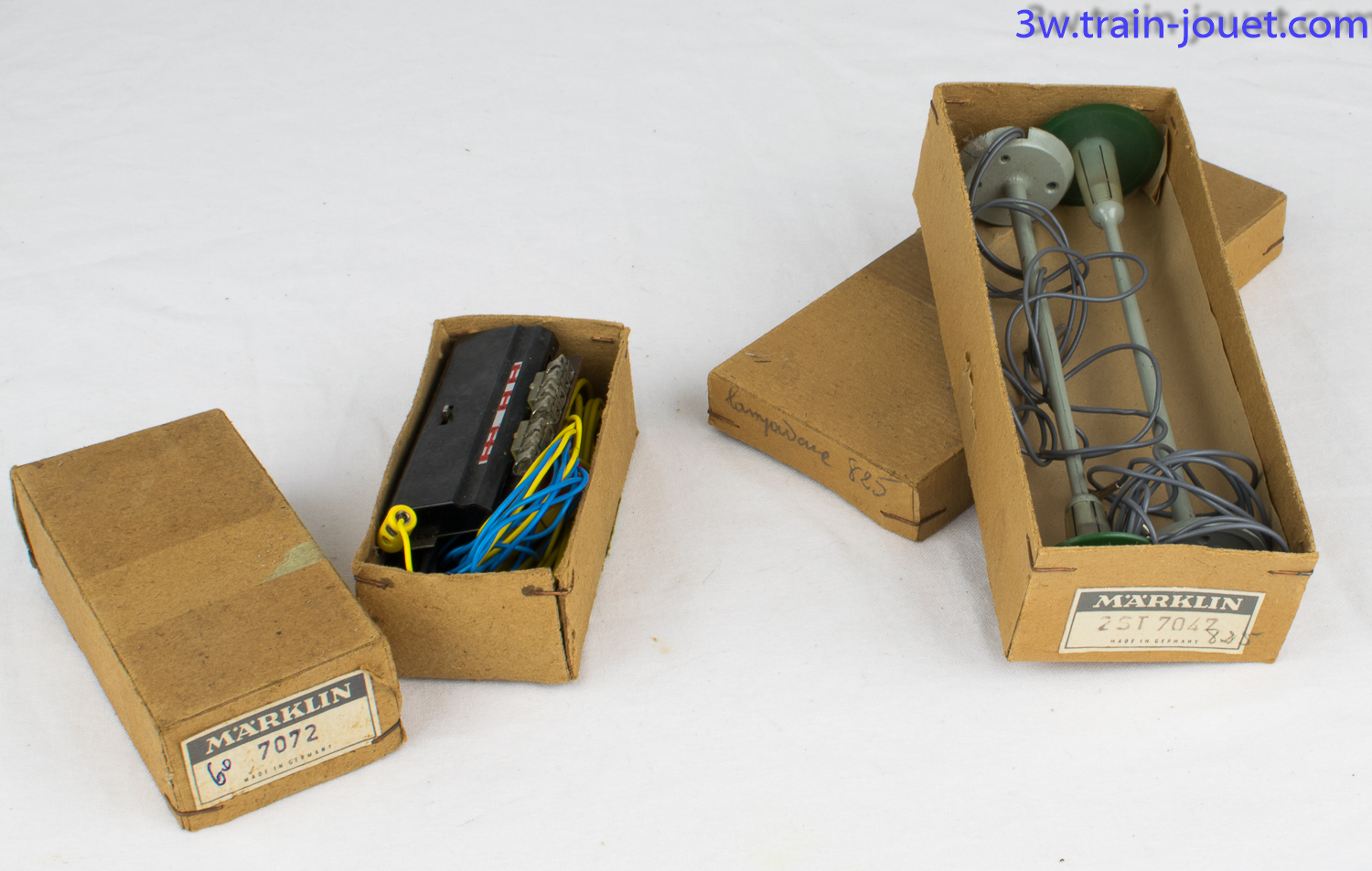 Deux anciennes boîtes Märklin contenant, pour l'une deux lampadaires (Réf 7047 - 2 ST), pour l'autre un contacteur et des fils (Réf sur boîte 7072). |