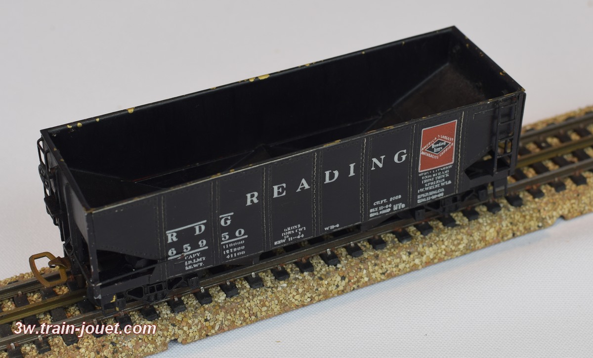 Wagon trémie en métal à bogies. Longueur 115mm. Reading (RDG 65950). Complet en très bel état. |