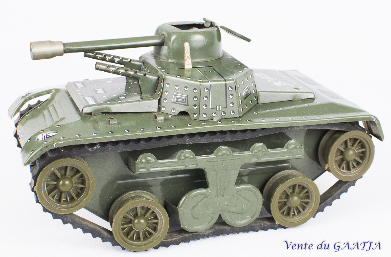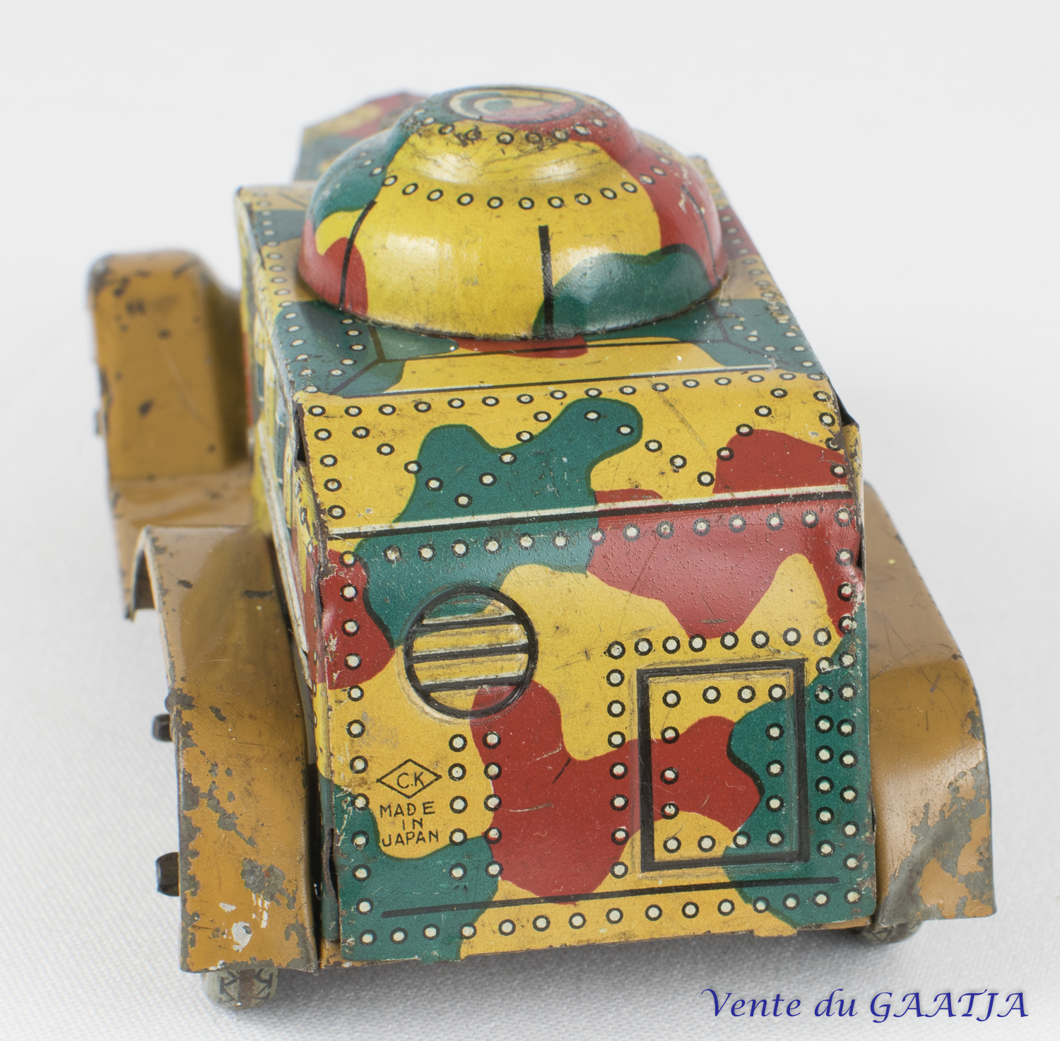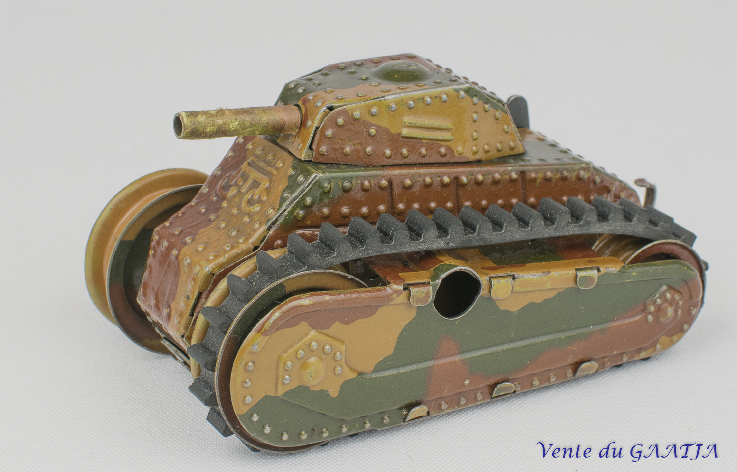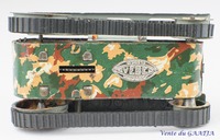 mécanique, motif camouflage Manque les deux chenilles & petit enfoncement au niveau du canon. Pas de clé. Fonctionne. 15 cm 50 Eur. + frais d'expédition (Tarif B) Réf. "JM32" |