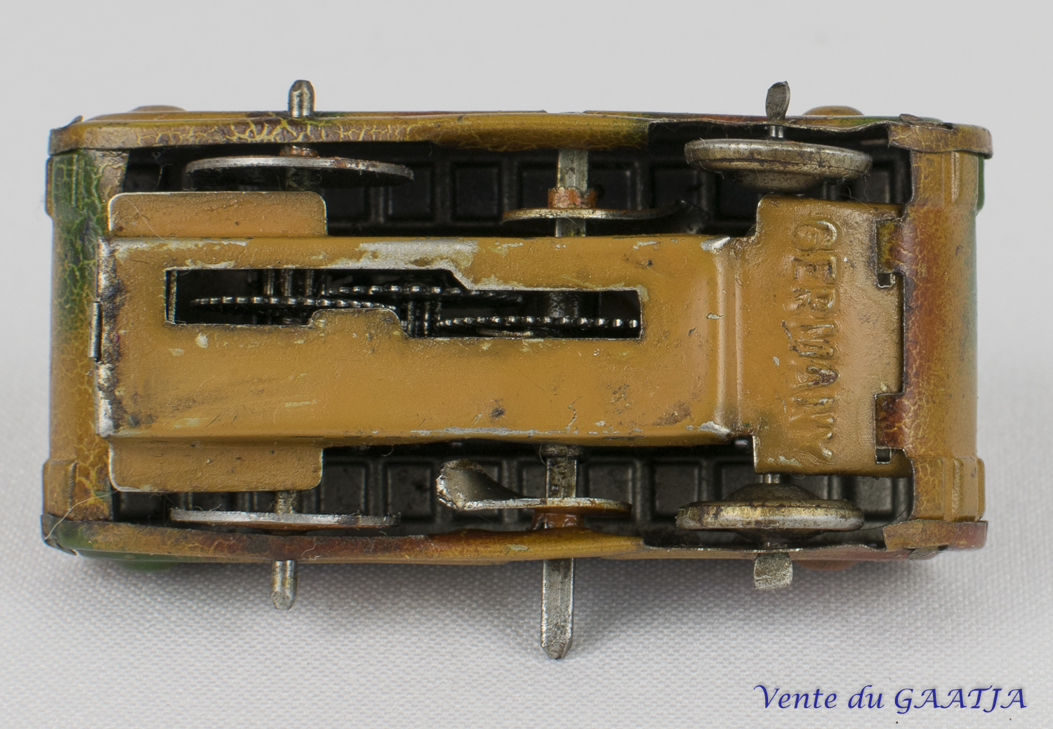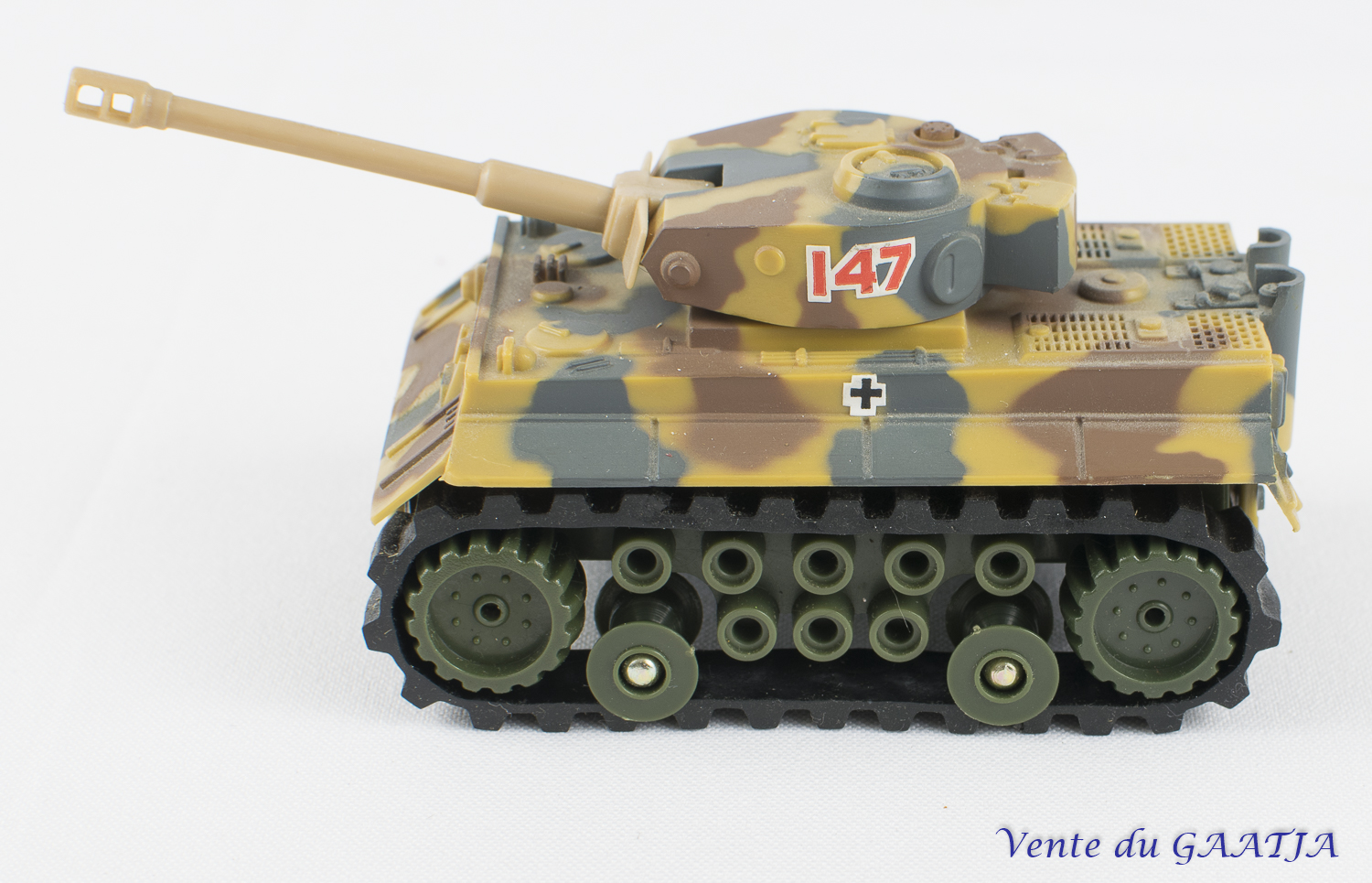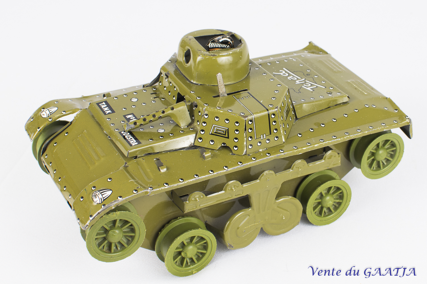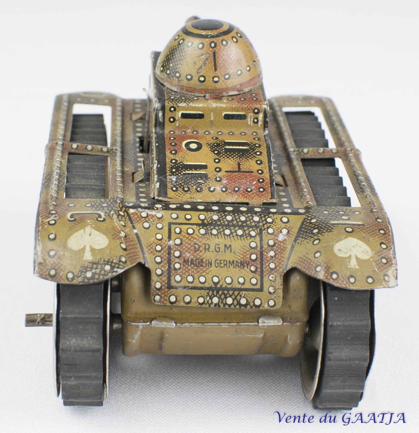 mécanique, motif camouflage Manque les deux chenilles & petit enfoncement au niveau du canon. Pas de clé. Fonctionne. 15 cm 50 Eur. + frais d'expédition (Tarif B) Réf. "JM32" |