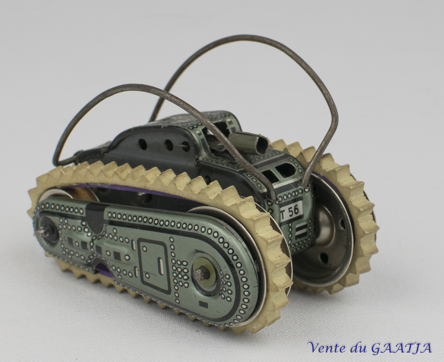 Petit Tank T56 mécanique à chenille, en tôle, 8 cm. D.B.P. Avec ses deux arceaux afin de se retourner. Moteur mécanique OK mais les chenilles sont lâches et doivent être changer. Pas de clé. 36 Eur. + frais d'expédition (Tarif A) Réf. "JM02" |