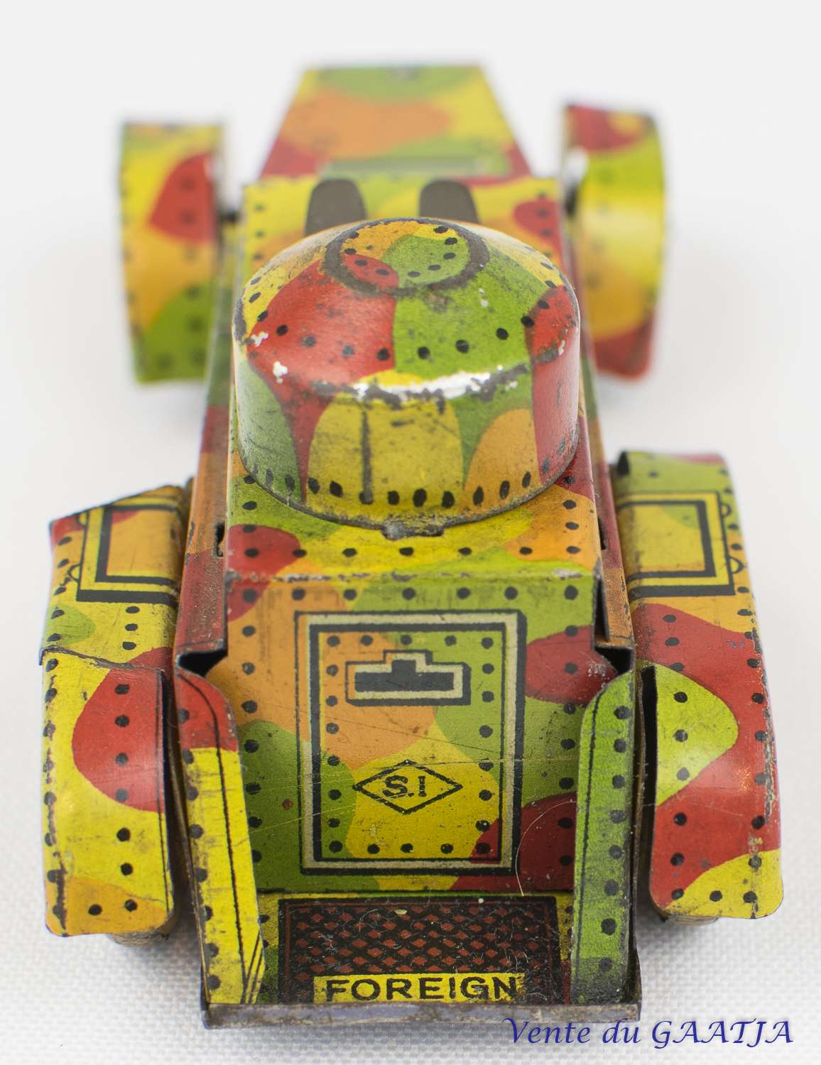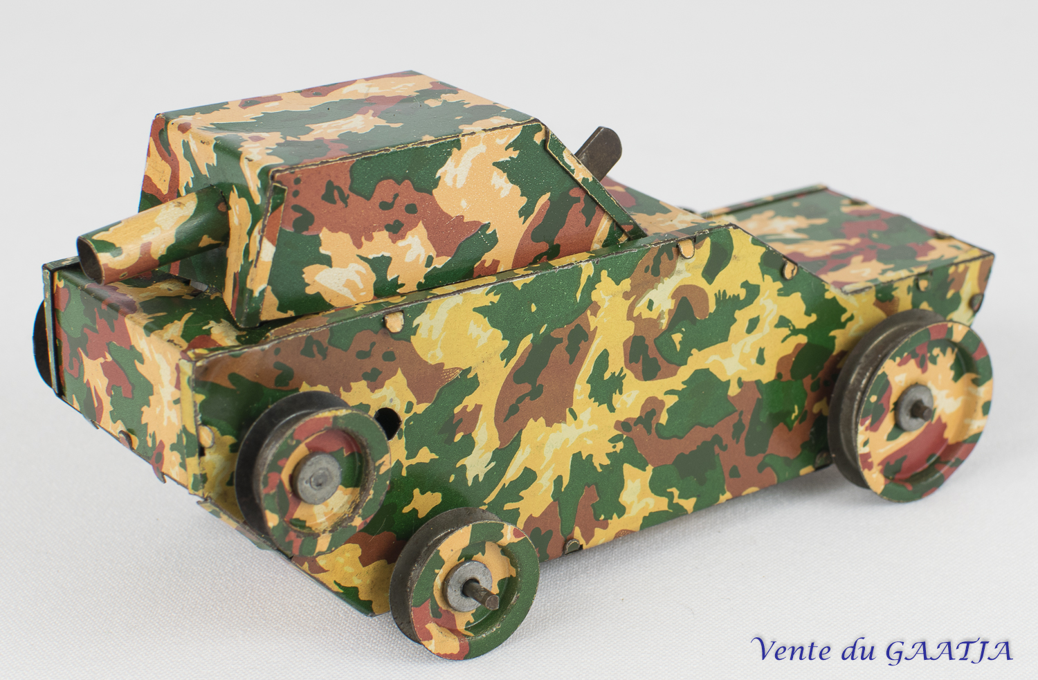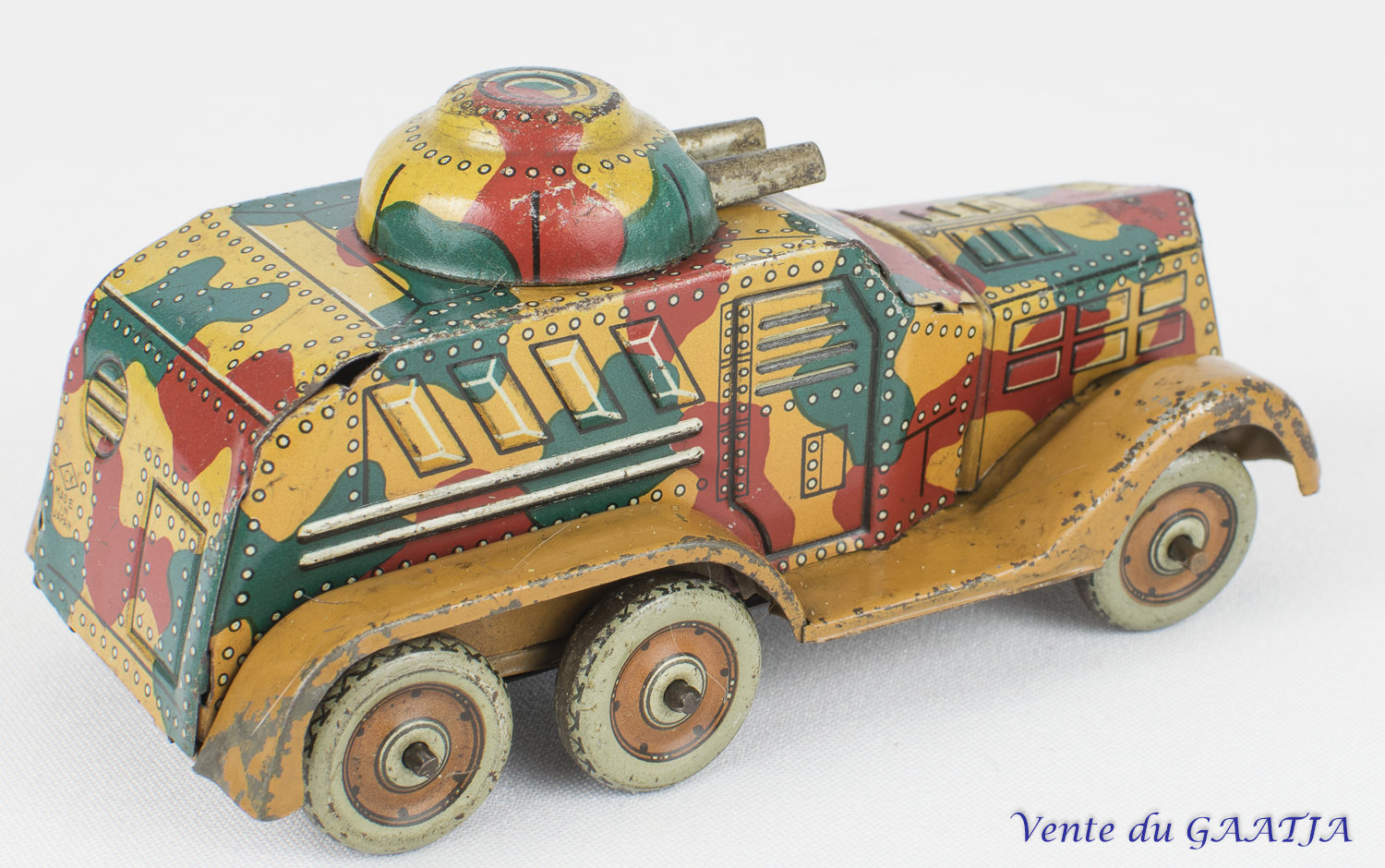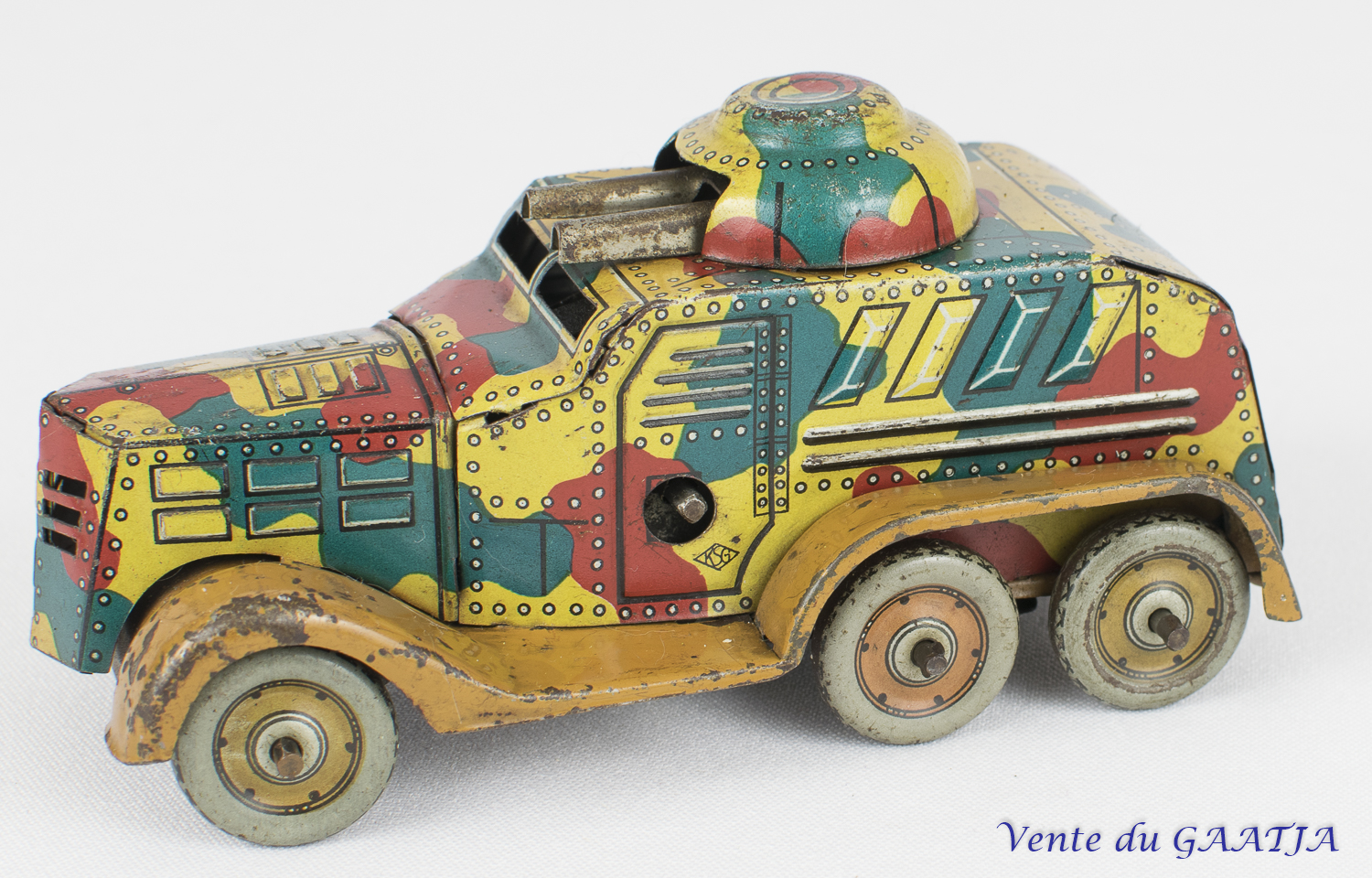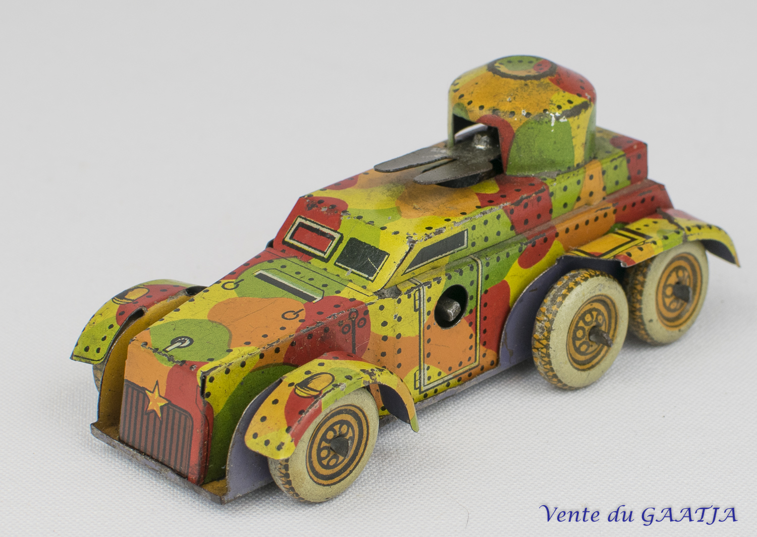 Auto-mitrailleuse "camouflage" mécanique en tôle. 10 cm, fonctionne. Pas de clé. Aile arrière gauche abîmée avec manque 50 Eur. + frais d'expédition (Tarif A) Réf. "JM50" Réservé |