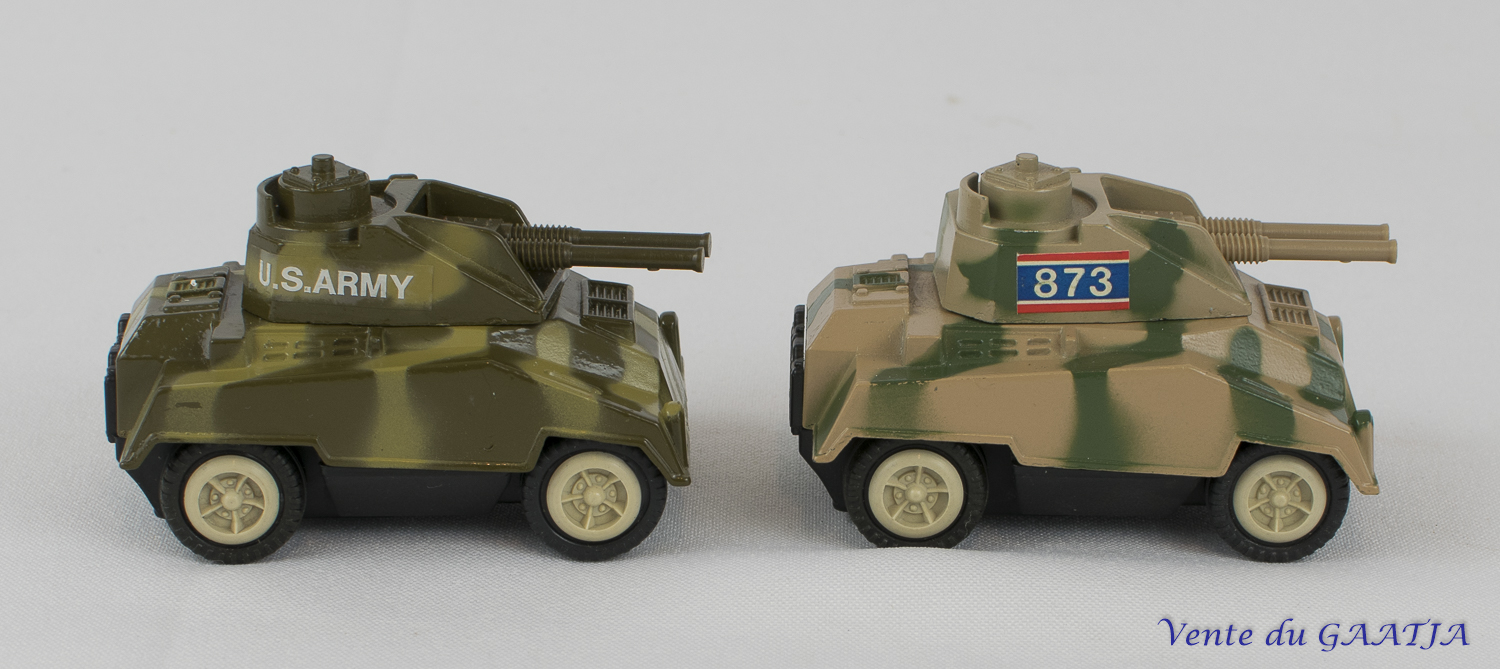 "Tchad" (2 pièces) - Le vert en bon état, manque l'antenne et peut-être quelques petits éléments, moteur un peu poussif et chenilles peu souples, - Le marron est à considérer "pour pièces", le moteur fonctionne. Pas de clé pour les deux 37 Eur. + frais d'expédition (Tarif D) Réf. "JM41" |