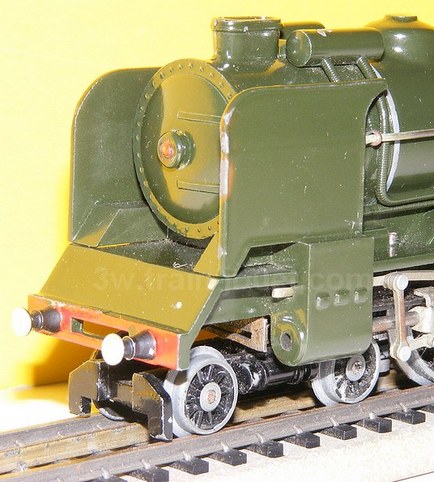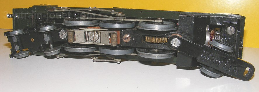 ![]() Les dessous de la belle. 2 galets pour prendre le courant sur le rail central. Le bissel avant présente quelques coups de limes afin que le passage sur les premiers aiguillages VB se passent sans soucis.... Entraînement du moteur par vis sans fin. Mécanique robuste à mon avis, mais que je n'aime pas trop bidouiller, le remontage pouvant être assez énervant...