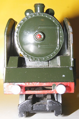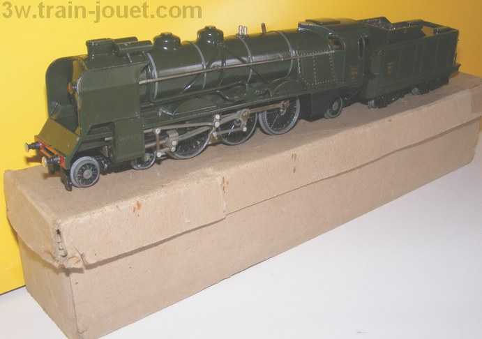 ![]() Vue d'ensemble avec sa boîte d'origine d'avant 1950. Carton simple qui a bien du mal à supporter le poids le la motrice. Les modèles suivants de boîtes seront en carton ondulé, plus costaud. La 3ème génération de boîte sera en carton rigide, décoré cette fois avec du papier jaune pâle et liserés verts.